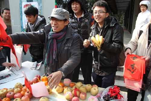 12月30日中午12点30分,在莲花路校区食堂门口正式开始活动,发放由员工会成员亲手制作的水果贺卡、新年礼物和宿舍定制的个性春联,并开展定制春联的现场活动。活动一开始,便吸引许多同学老师的参与,大家到指定地点领取水果贺卡,并为自己寝室现场定制春联,“静理禅机翻贝叶,闲中妙句叹梅花”,“旧岁又添几个喜,岁末更上一层楼”.10级播音与主持艺术系的李博文同学现场写作,并创作了一副春联赠与校医务室。水果贺卡是由员工会成员在29日下午集体制作的,以新鲜水果为原材料,在水果上做出自己的创意,表达制作者对大家的祝福。为校园营造了一片节日的氛围。