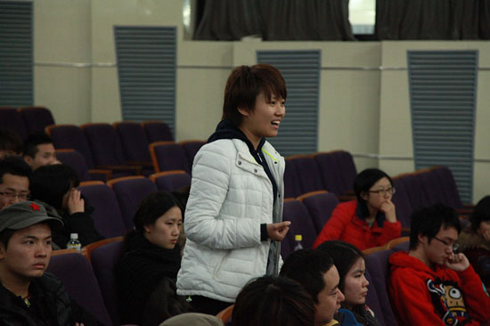 接下来,同学们围绕着展映影片的艺术内涵、创作过程,结合自己在专业学习和艺术实践中的困惑,纷纷向两位老师提问。李忱和洪帆老师以幽默犀利的言辞、真诚率性的表达对同学们的问题逐一耐心解答,并不断鼓励大家勤于思考、勇于实践、善于总结,在实现艺术理想的道路上执着前行。不知不觉已到了晚上6点,这一场超长的讲座在师生们热烈的交流中不得不结束了。