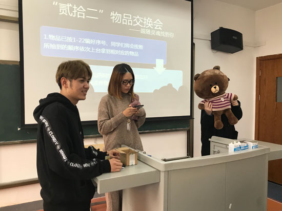 图为同学们上台交换物品