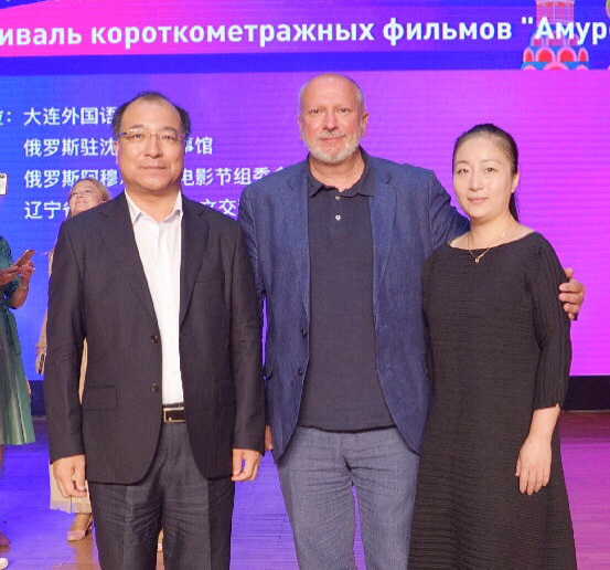 图为杨默老师与阿穆尔之秋电影节组委会主席及大连外国语大学丛明才副董事长合影
