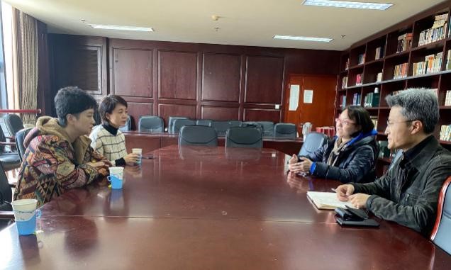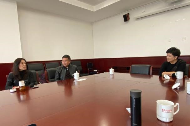 图为与中戏电影电视系实验室负责人交流
