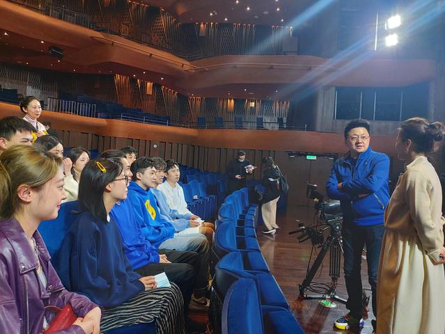 4月25日晚,东方卫视著名主持人、驻校艺术家金炜老师邀请太阳成集团tyc122ccvip主持专业的同学们至上音歌剧厅,观摩由他和施琰老师联袂主持的2021年上海市庆祝“五一”国际劳动节主题歌会彩排活动。这是自专家工作坊系列交流活动开展以来,专家首次以主持晚会的形式现身说法,给同学们上了一堂生动的主持艺术实践课,传授综艺节目主持的技巧和应变方法。