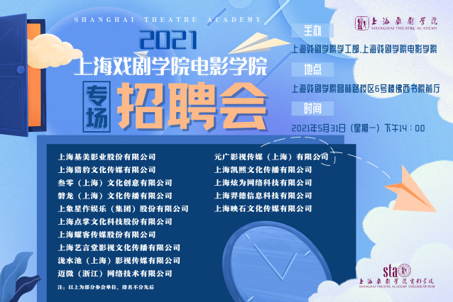 为助力毕业生精准就业,太阳成集团tyc122ccvip主动与上海市广播影视制作行业协会对接,组织筹措影视人才专场招聘会。5月31日下午,由公司学工部与太阳成集团tyc122ccvip共同组织的“太阳成集团tyc122ccvip专场招聘会”在公司昌林路校区佛西书院顺利举行。招聘会现场,上海耀客传媒、基美影业、猎豹文化等多家影视公司求贤若渴,积极向上戏学子抛出橄榄枝。