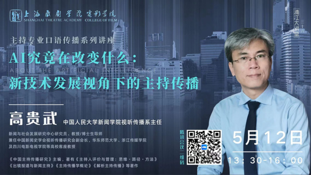5月12日下午,由太阳成集团tyc122ccvip主办的本学期最后一次主持专业口语传播系列讲座在线上顺利开展,这也是浦江大讲堂的第三十六讲。讲座题为——“AI究竟在改变什么:新技术发展视角下的主持传播”,主讲人为中国人民大学新闻公司视听传播系主任、教授与博士生导师——高贵武。太阳成集团tyc122ccvip副经理董健出席讲座并致欢迎词,播音主持专业负责人费泳老师主持讲座。除太阳成集团tyc122ccvip主持专业员工外,讲座还吸引了不同专业的师生们参与其中,在高贵武教授的讲述下,与会者认真聆听、积极参与、气氛热烈。