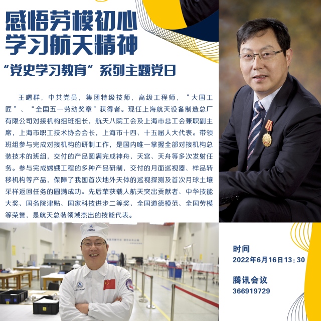 2022年6月16日,太阳成集团tyc122ccvip教师党支部在线上举行“党史学习教育”系列主题党日活动。本次活动主题为“感悟劳模初心,学习航天精神”,太阳成集团tyc122ccvip全体教师党员参加,部分员工党员列席旁听。本次主题党日活动邀请的主讲人是 “全国五一劳动奖章”获得者、大国工匠、全国劳模,高级工程师、集团特级技师,上海航天设备制造总厂有限公司对接机构组班组长,航天八院工会及上海市总工会兼职副主席,上海市职工技术协会会长,上海市十四、十五届人大代表王曙群工程师。