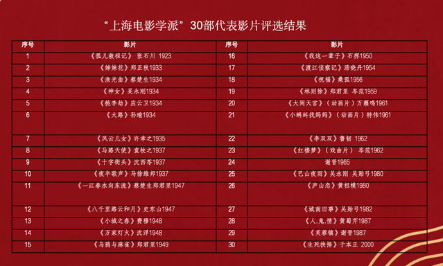 入选的30部代表影片和30位代表影人,与几代上海电影人共同创造了上海电影的辉煌历史,展现了上海城市生活和时代风貌,形成上海电影独特的美学文脉和创作经验。“上海电影学派”有其明显的美学特征:人道价值、底层叙事、通俗法则、清丽风格、国际视野、商业意识。本次评选的“上海电影学派”30部代表影片是上海电影的经典之作,蕴含了电影创作的上海经验和上海精神。