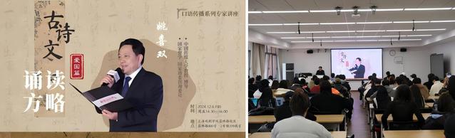 讲座中,姚教授特别强调了“先达意再传情”的原则,指出诵读者应首先确保意义的准确传达,然后再传递情感,以便观众能够产生共鸣。他提倡,在诵读时关注句群而不是单个句子,以实现连贯流畅的效果,使受众感到舒适。