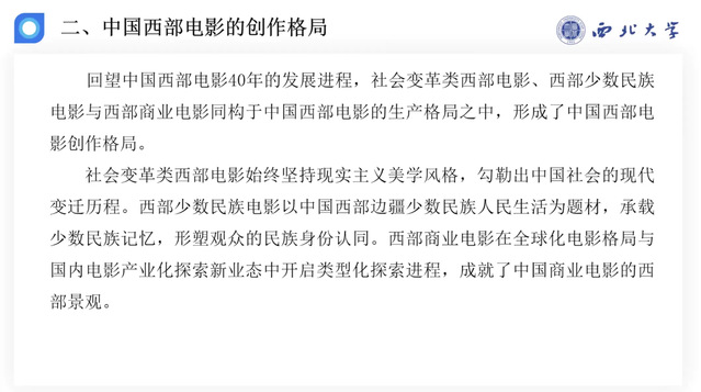 他提到,以往电影研究较少关注区域地缘要素,而本次区域电影系列探讨为电影研究开辟了新的视角和方法。他围绕中国西部电影文化属性、中国西部电影的创作格局、中国西部电影一种风格探索三个方面,展开了深入阐述。