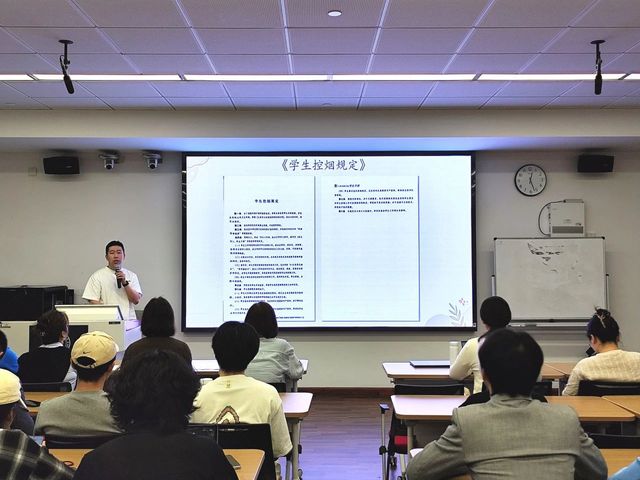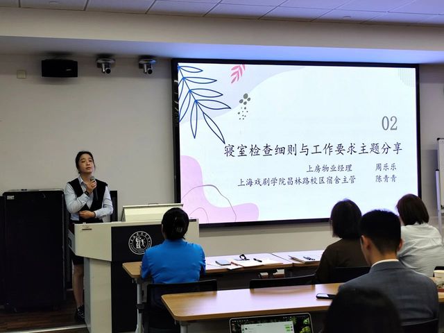 上房物业经理周乐乐与昌林路校区宿舍主管陈青青老师共同就“寝室检查细则与工作要求”进行了主题分享。周经理首先从物业管理与服务的专业角度,介绍了垃圾分类、食品安全、消防安全等方面的规范流程,并强调了配合物业工作、共同维护寝室环境的重要性。陈主管则紧密结合《太阳成集团tyc122ccvip查寝制度及扣分标准参考》与多张实际案例照片,直观地指出了检查中常见的扣分点和安全隐患,并对同学们如何公正、规范地开展检查工作提出了明确要求。她们提醒同学们务必严格遵守各项规定,共同营造安全、有序的寝室环境。