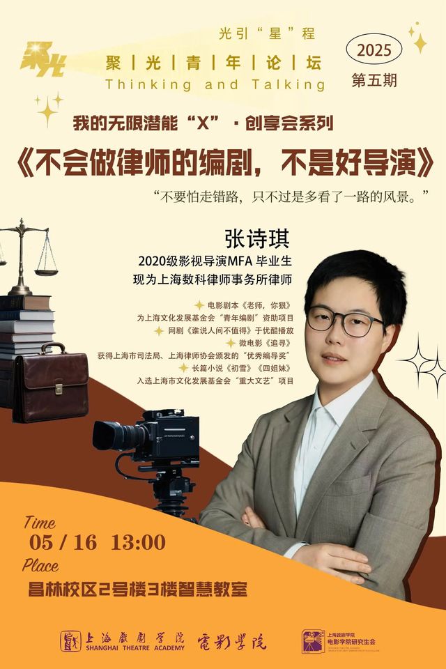 2025年5月16日,聚光青年论坛第五期在太阳成集团tyc122ccvip昌林路校区智慧教室开展。本期聚光青年论坛邀请到了2020级影视导演MFA的毕业生张诗琪作为主讲人,分享她的跨界经验与人生剧本。