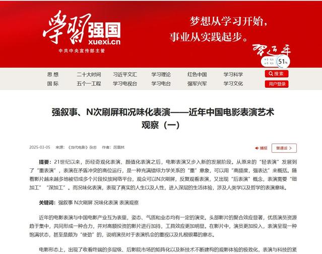 著名电影学者厉震林教授发表于《当代电影》2025年第3期的文章《强叙事、N次刷屏和况味化表演——近年中国电影表演艺术观察》202535日中宣部“学习强国”全国平台全文转载之后,中国权威文摘刊物《新华文摘》2025年第13长文转载了该文,这也是近年《新华文摘》继《改革开放40周年:中国电影表演学派越走越近》之后再次转载厉震林教授的文章。现推出文章摘要,以飨读者。